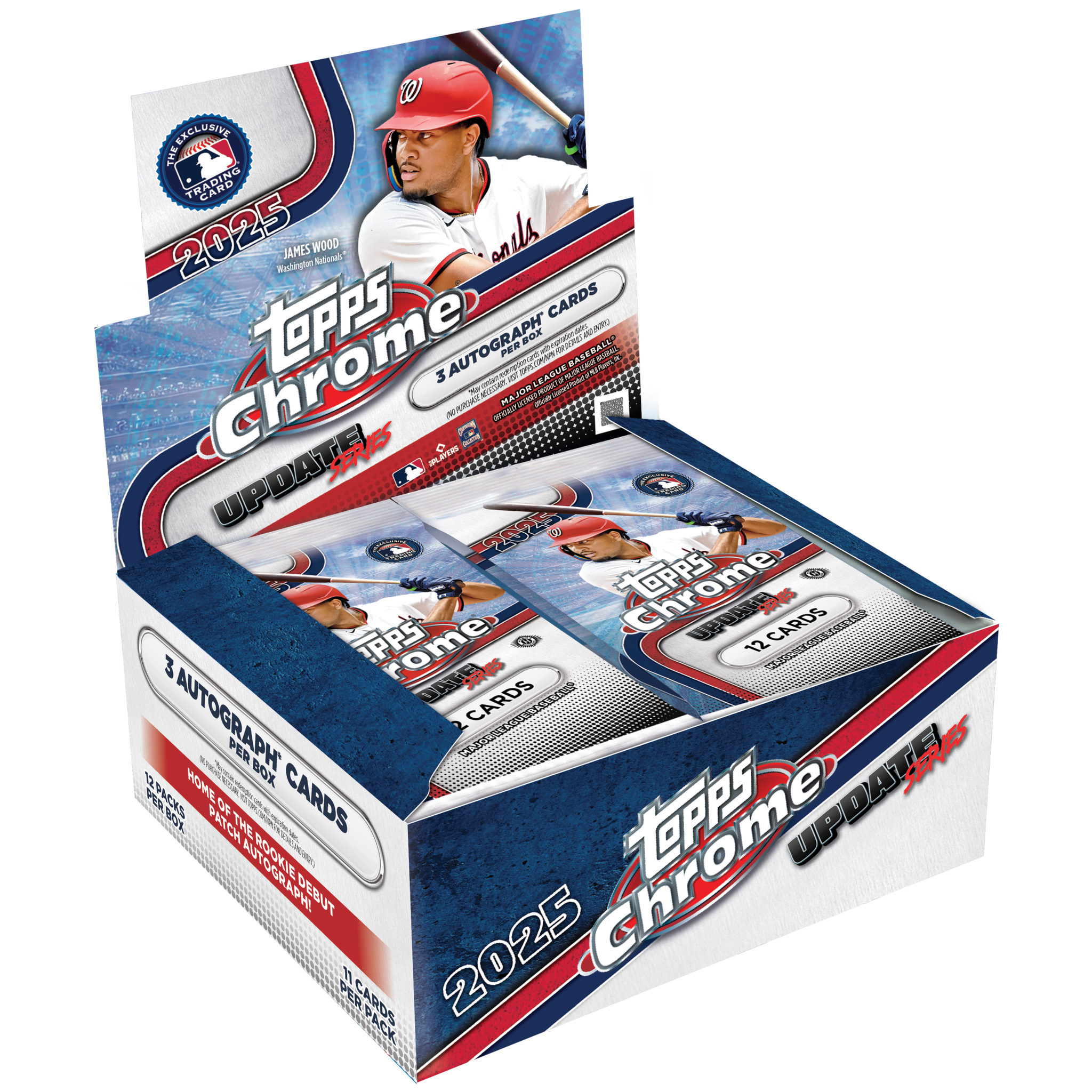 2025 Topps Chrome Update Baseball Jumbo delivers 3 Chrome autographs per box, with 8 boxes per case. Exclusive jumbo configuration, massive 200-card checklist, and sizzling color parallels. Chase SSP Helix, Chrome Exposé, and unique Lava Lamp Rookie Autos. Loaded with rookies, stars, and legendary names!