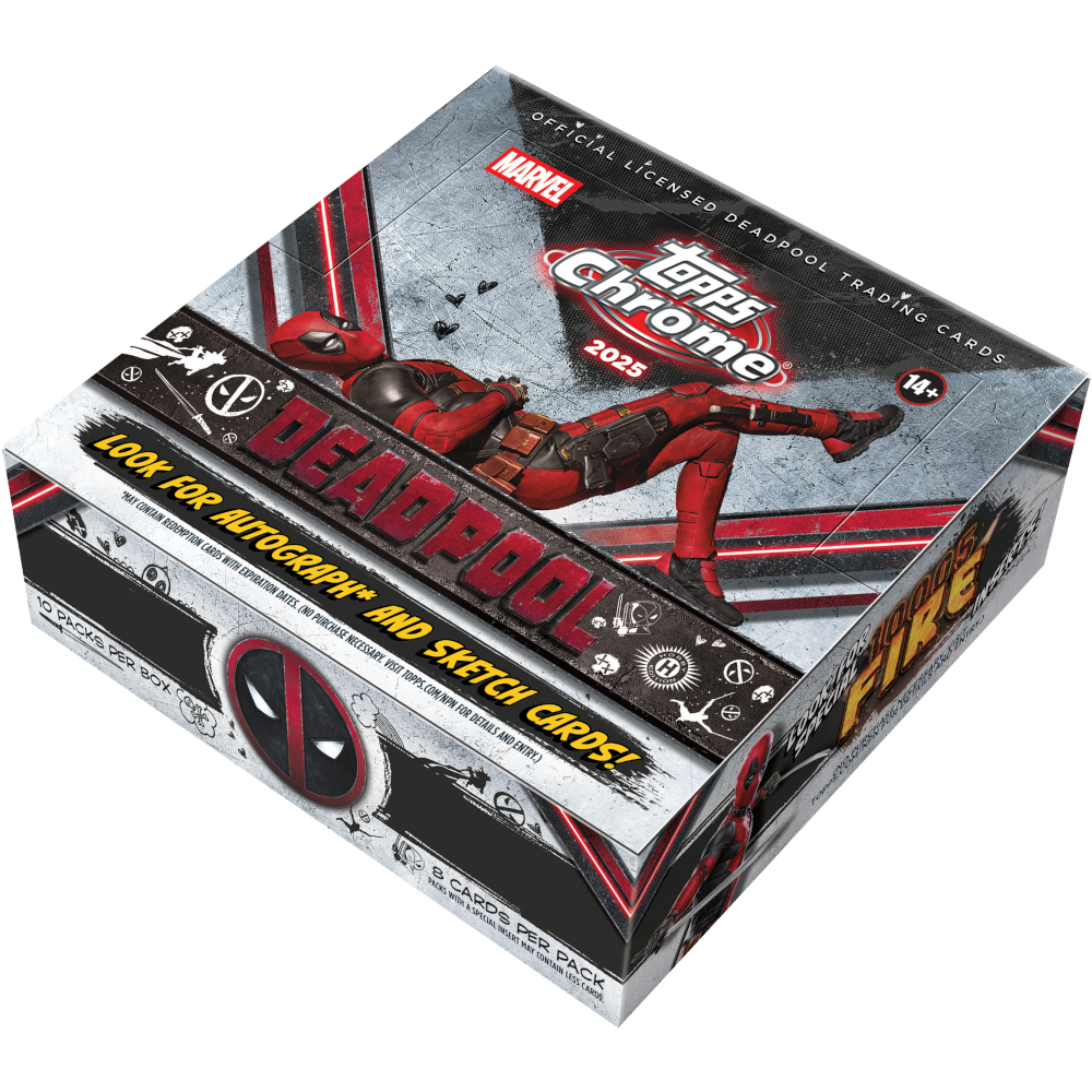 2025 Topps Deadpool Chrome Hobby delivers 1 Sketch or Autograph Card, 4 numbered parallels, 5 refractors, 4 Hobby-exclusive Prism Refractors, and 10 inserts per box. Loaded with original art, all-new inserts, case hits, and exclusive parallels—perfect for Marvel and Deadpool fans chasing both comic and cinematic legends.