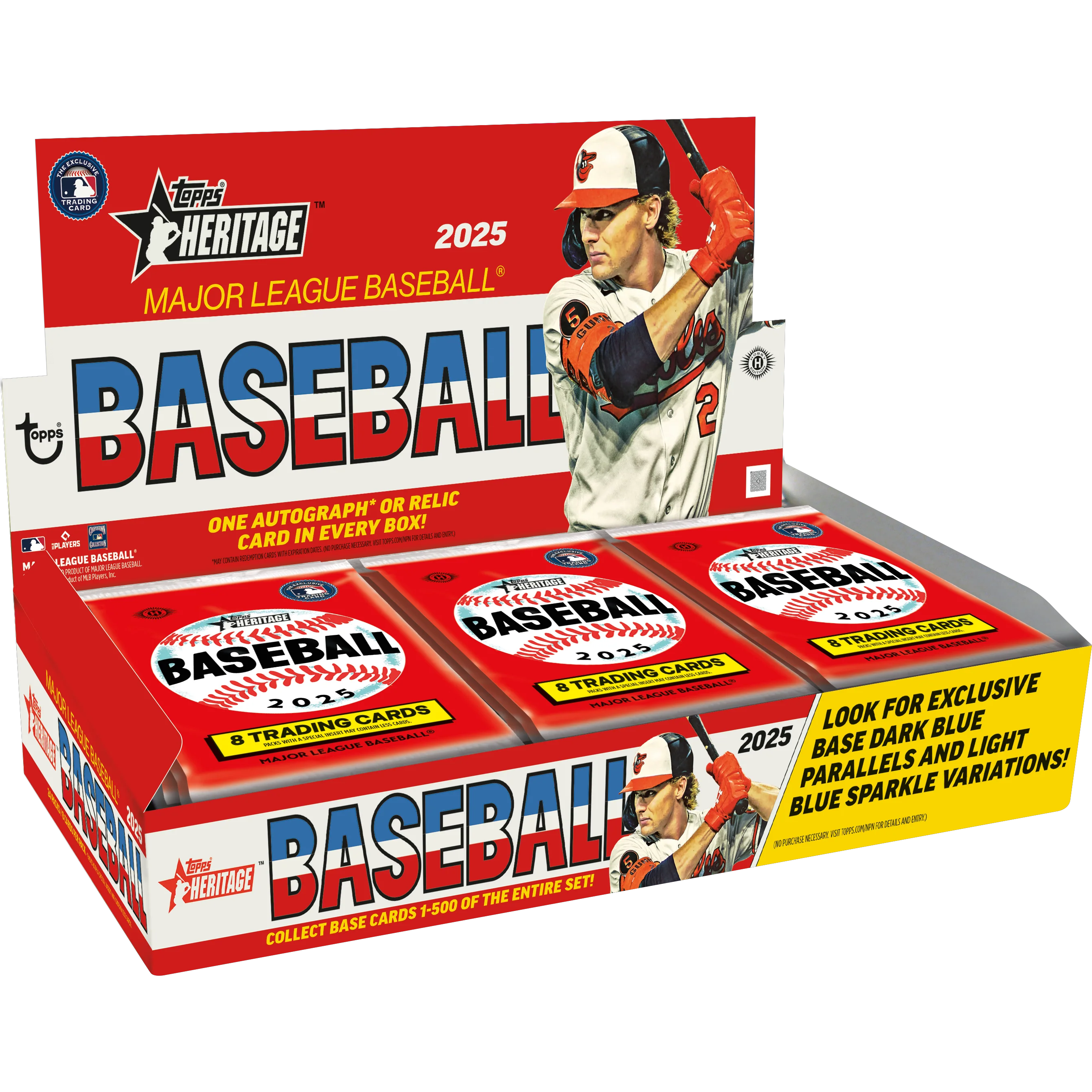 Celebrate the Bicentennial and the 1976 Topps design in the classic 2025 Topps Heritage Baseball Hobby release! This flagship tribute blends old-school design with new-era stars. Collect a 500-card base set including Record Breakers, Father and Son duos, League Leaders, and more. Every hobby box delivers 1 autograph or relic card, plus a chance at rare image variations, on-card autos, chrome SuperFractors, and new Bicentennial inserts.