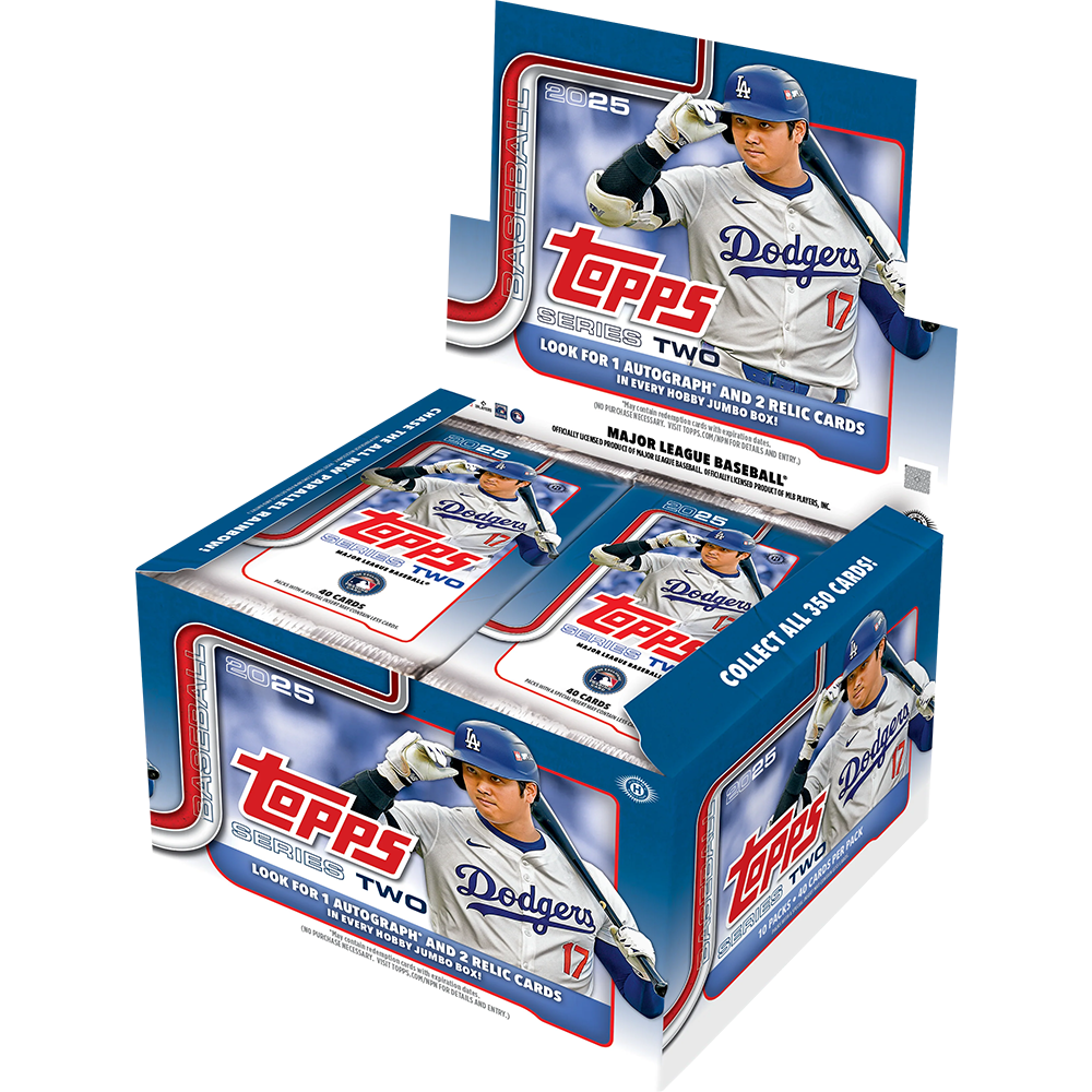 The 2025 Topps Series 2 Jumbo Baseball delivers flagship MLB collecting at its biggest, packed with current stars, legends, and the hottest rookies. This Hobby Jumbo SKU stands out with a soaring 350-card base set, dynamic inserts, and exciting chase cards. Every box delivers one autograph card, two relic cards, and two exclusive silver promo packs loaded with chrome cards of MLB’s top veterans, rookies, and retired greats. Collectors will find cards and autographs from sought-after names including rookies Luisangel Acuña, Jackson Jobe, Kumar Rocker, Roki Sasaki, and Kevin Alcántara, as well as veteran stars Shohei Ohtani, Mookie Betts, Juan Soto, Pete Alonso, and Fernando Tatis Jr.