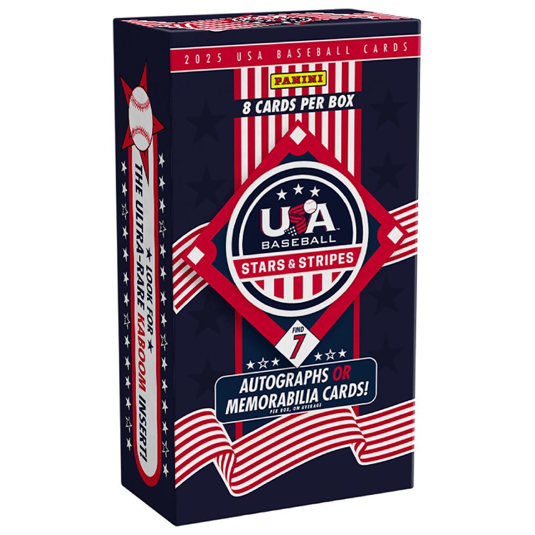 2025 Panini Stars & Stripes Baseball Hobby Edition: 1 pack/box, 7 autos/memorabilia, exclusive parallels, and ultra-rare Kaboom! inserts featuring USA’s top baseball talent.