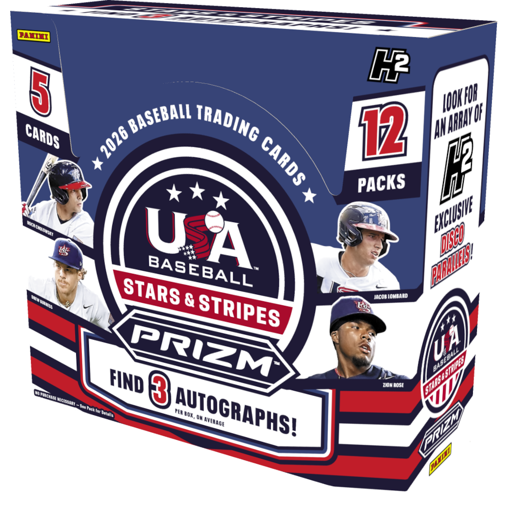 2026 Panini USA Stars & Stripes Prizm Baseball H2 brings the iconic Prizm stylings to USA Baseball for the very first time! This Hobby H2 product boasts a robust 200-card base set, featuring top up-and-coming USA Baseball talent like Liam Peterson, Ace Reese, and Drew Burress. H2 boxes offer 3 autographs, 18 Prizm parallels, and 9 inserts per box, along with exclusive Disco Prizms and the ultra-rare Color Blast chase! Find signature cards from notable names such as Jorvroskie Lane Jr., Jacob Seamon, Roch Cholowsky, Grady Emerson, and AJ Gracia, spanning both today’s youth pipeline and legendary alumni. This exciting release gives collectors deep checklist variety and great hit potential only found in 2026 Panini USA Stars & Stripes Prizm Baseball H2.