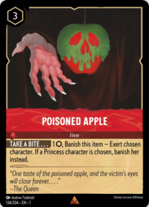 Items are played for their ink cost and put on the field above the inkwell. They come out ready and face up. They have unique abilities and can often be used turn after turn. You can play multiple items a turn if you can pay the ink. Item cards stay on the field until discarded or banished by their cost or another card’s ability. They can’t be targeted in challenges, and don’t have Lore, strength, or willpower stats.